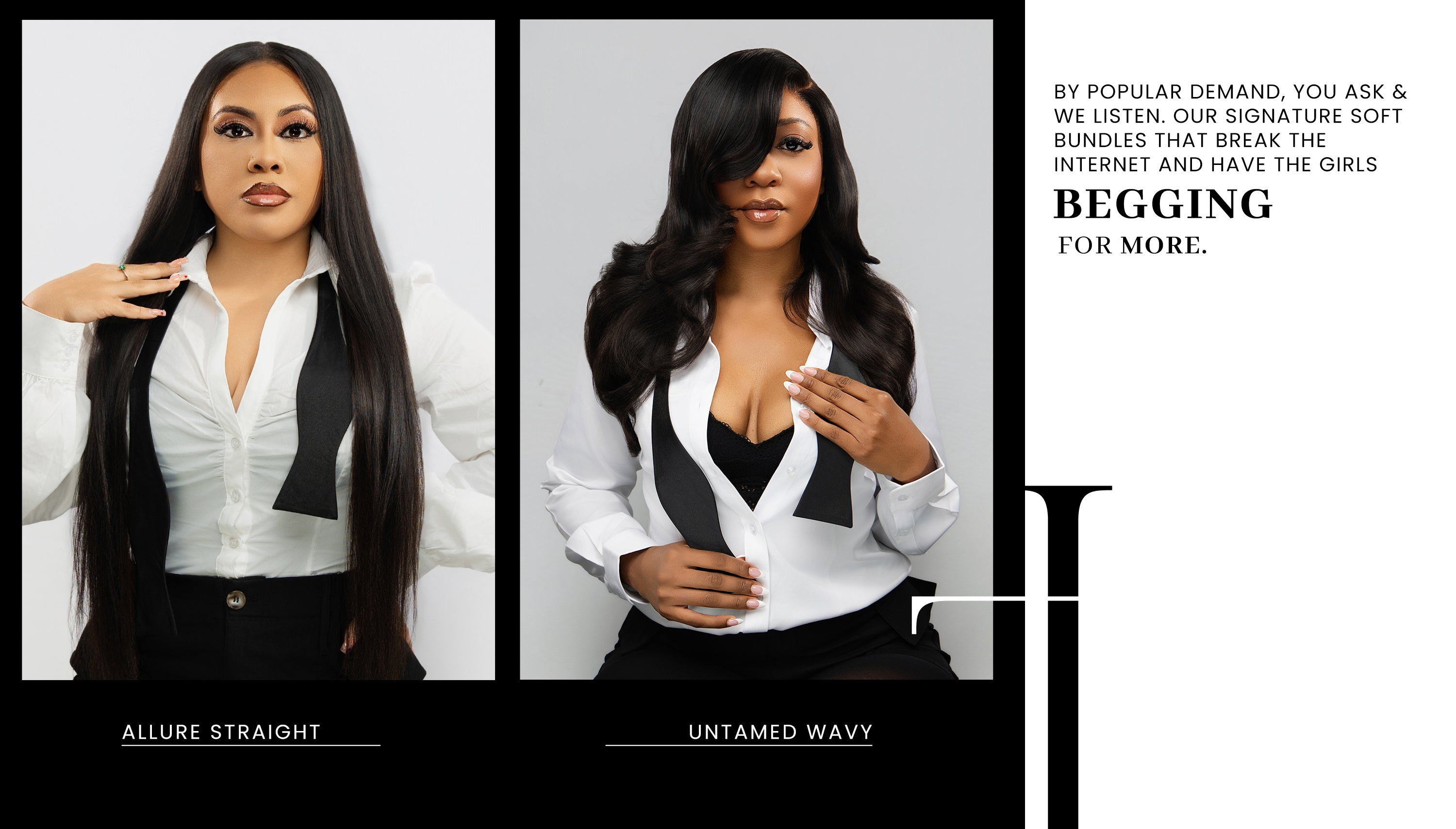 THICK. LUSH. IN YOUR FACE. OUR EXTENSIONS ARE SOURCED FROM THE MOST COVETED ORIGINS, UNTOUCHED AND UNCOMPROMISED, DESIGNED TO SLIDE THROUGH YOUR FINGERS, CATCH THE LIGHT, AND COMMAND ATTENTION.